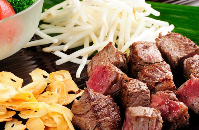 스테이크 (미소노특선와규히레(A4)120g 또는 고베 비프 살코기120g)/샐러드/구운 야채 3종/해산물 2종/밥/된장국/절임/커피 또는 아이스크림